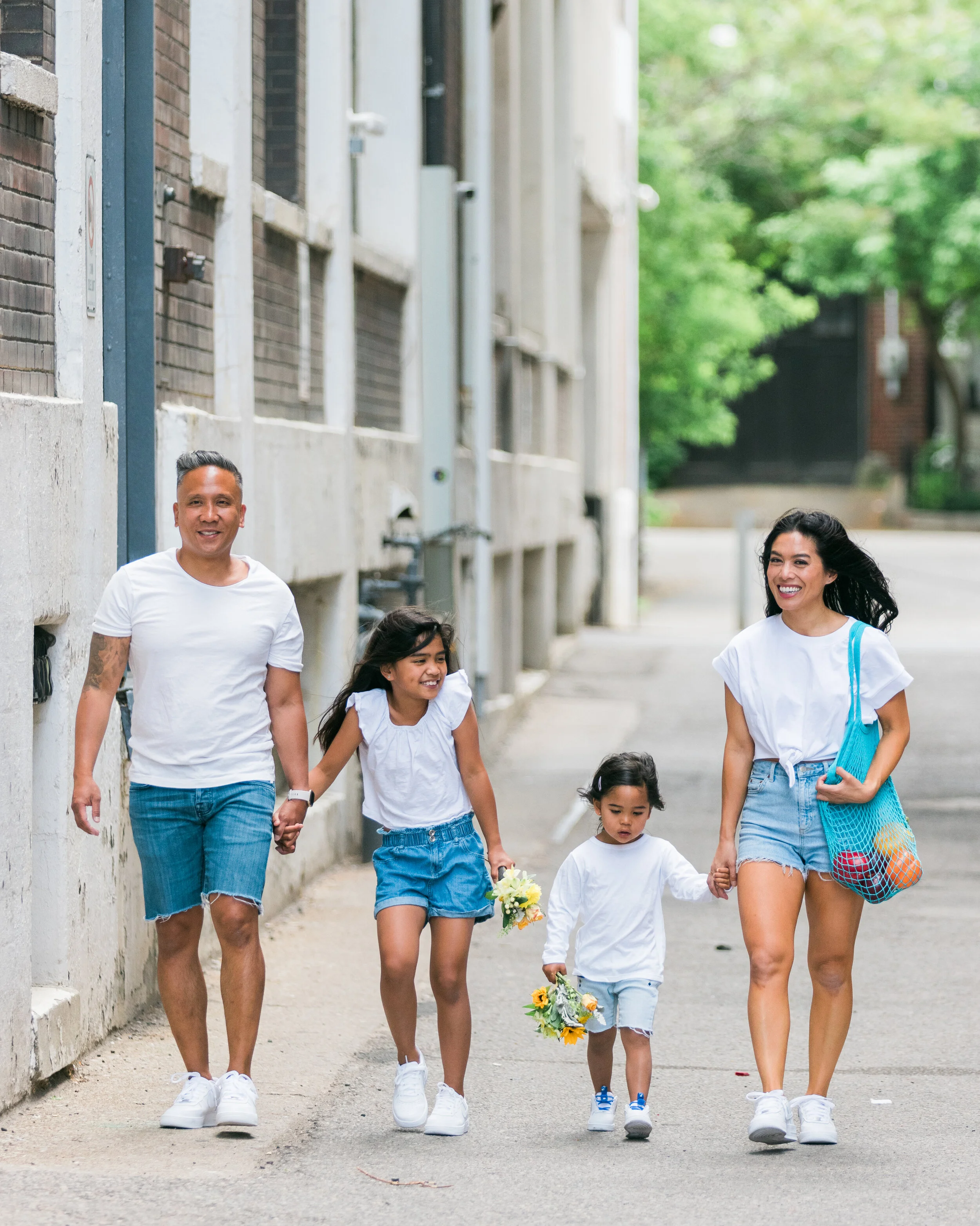 Denim is always a good idea. You can still essentially “match” in jeans - regardless of the wash. You just can’t go wrong with jeans and a classic white tee. It’s a look that allows you to “match” without matching!